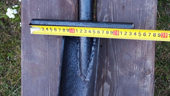 Из трубы диаметром 16 мм вырезаем опору для ноги. Также отрезаем черенок для лопаты и готовим наши детали к сварке. Сначала их соединяем прихватками, затем убедившись, что все получилось правильно, свариваем окончательно.