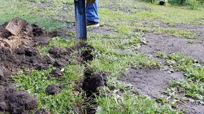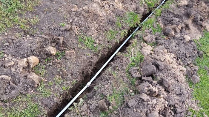 Копать такой лопатой совсем не сложно, довольно легко, но процесс получается немного замедленным. Примерно за 1 час можно выкопать траншею длиной около 35 метров, что вполне не плохо для ручной работы. В траншею укладываем пластиковую трубу и засыпаем землей.