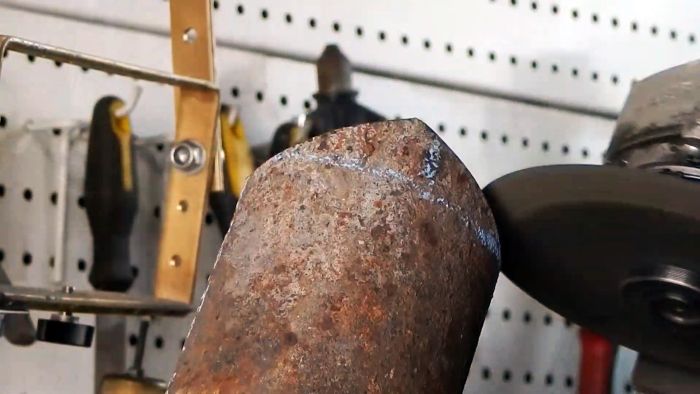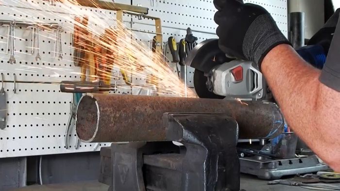 Конец лопаты заостряем, чтобы было легче вкапываться в землю и перерезать встречающиеся в почве корни. По размеченным линиям болгаркой вырезаем контуры лезвия и наконечник лопаты. С помощью зачистного круга выравниваем линии реза и делаем заточку лопаты изнутри. Обдирочным диском удаляем старую ржавчину и грязь с поверхности трубных заготовок.
