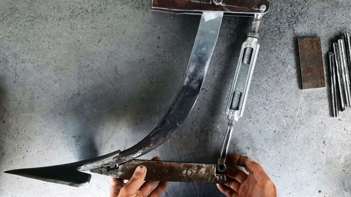 На конце стойки культиваторной лапы сверлим отверстие диаметром 1,2 см и с помощью болта и гайки крепим по сторонам стойки 2 пластины с отверстиями. Между узкими краями пластин размещаем одну из проушин талрепа М16 и также закрепляем болтом с гайкой.