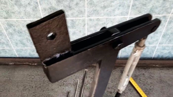 К нижней части стойки прижимаем скошенный край сварной полевой доски из двух квадратных прутков 2×2 см и привариваем их друг к другу. К краям выреза с другого конца полевой доски привариваем две толстые шайбы с обточкой под прямой угол. Между шайбами устанавливаем нижнюю проушину талрепа и закрепляем болтом и гайкой.