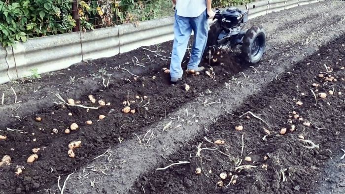Такая конструкция картофелекопалки с регулируемым углом атаки лапы в зависимости от свойств грунта и короткими прутками, предназначенными не для просеивания земли, а для ее расталкивания, обеспечивает малое сопротивление и, поэтому на мотоблок нет необходимости устанавливать грунтозацепы или утяжелители.