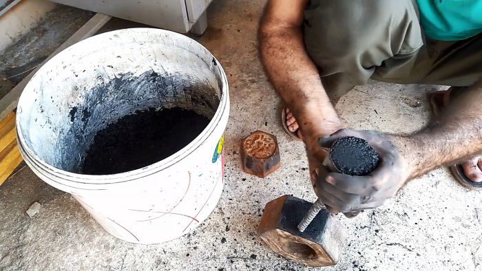 Набиваем в цилиндр влажную смесь угольного древесного порошка и пищевого крахмала. Далее ставим заполненный смесью цилиндр на твердую и массивную опору. Сверху на смесь устанавливаем круг и ударяем молотком или массивным грузом по торцу арматуры, добиваясь ее уплотнения.