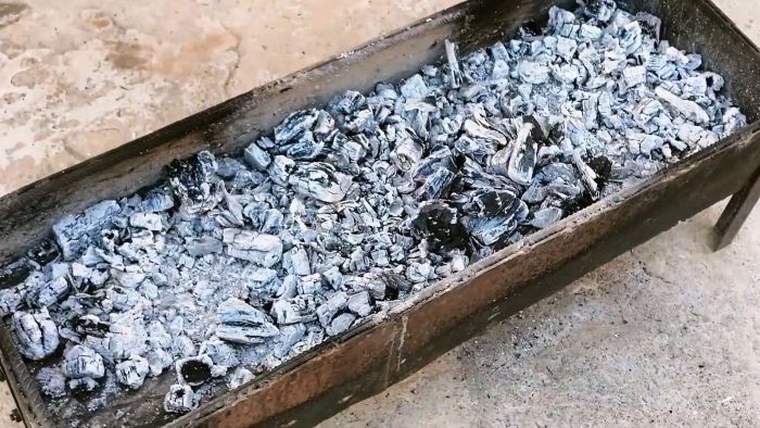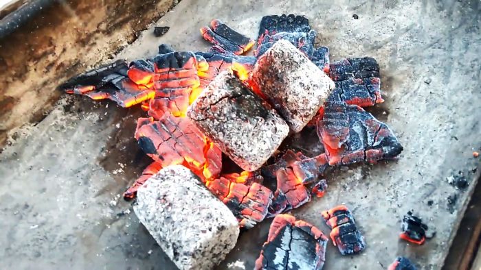 Протестируем брикеты в деле. Укладываем их вперемешку с растопкой снова в мангал и поджигаем. Через 15 минут растопка сгорает и начинают гореть брикеты, и это будет продолжаться 2 часа, после чего остается лишь маленькая горстка золы.