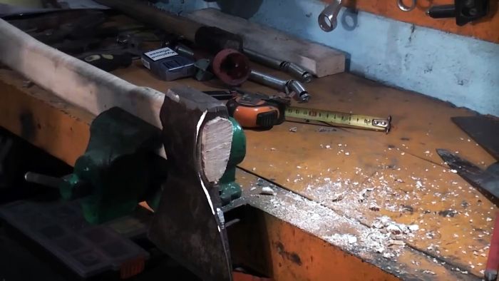 Оставляем примерно 1 см топорища от края проушины и отрезаем ручной ножовкой выступающую из проушины часть ручки, из которой в дальнейшем изготовим клин для укрепления головки топора на топорище.