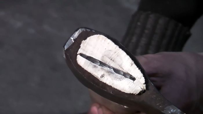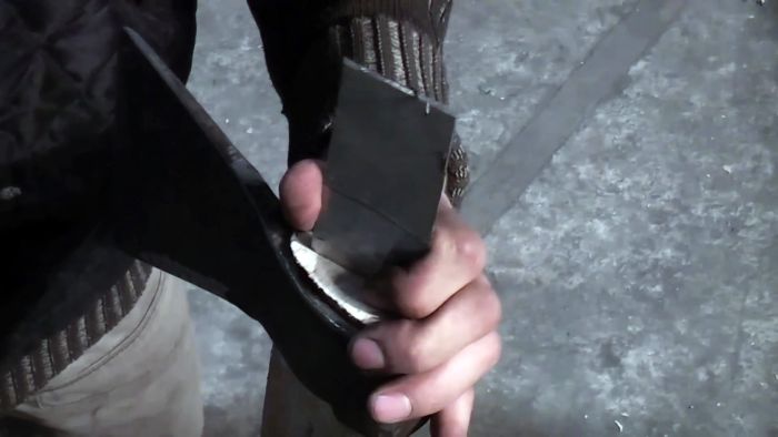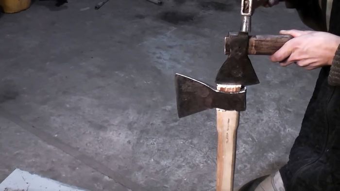 Отрезаем верхнюю часть стального клина болгаркой, оставляя примерно около 1 см снаружи. Эту оставшуюся часть клина забиваем молотком в топорище заподлицо с его торцевой плоскостью.