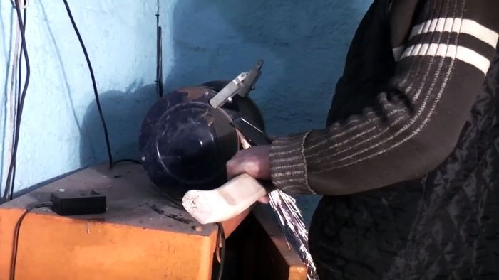 Подгоняем поперечное сечение топорища на некоторой длине от края к головке топора посредством заточного станка. После такой обточки, набиваем головку топора на ручку, ударяя по его свободному концу увесистым молотком, другим топором или о твердую поверхность до тех пор, пока головка топора не перестанет двигаться по топорищу.