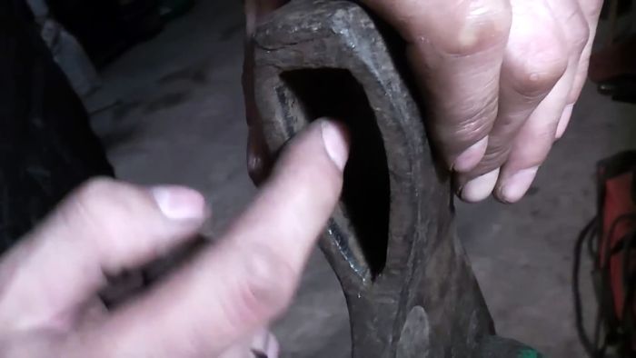 Начинаем процесс насадки с удаления зазубрин внутри проушины и краев с помощью напильника. Также сглаживаем кромки головки топора, образовавшиеся на нем за долгие годы применения, на заточном станке.