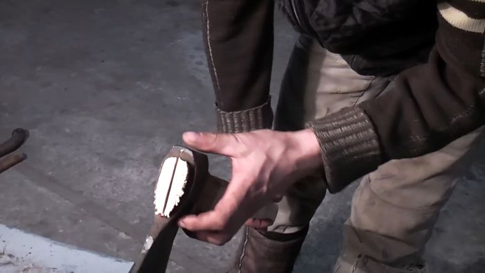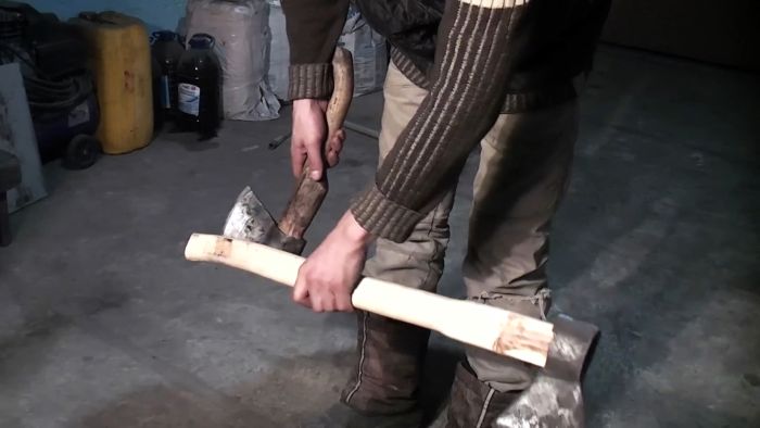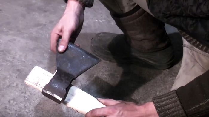 Процесс насадки головки топора на деревянное топорище дедовским способом