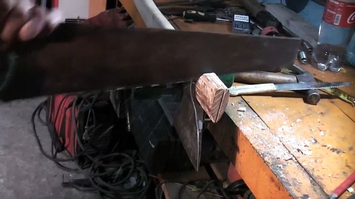 На заточном станке из подходящей по толщине и ширине стальной пластины формируем конусообразный клин и забиваем его в топорище наискосок, т. е. по диагонали, чтобы распереть посадку деревянной ручки в головке топора по четырем углам и всему периметру проушины.
