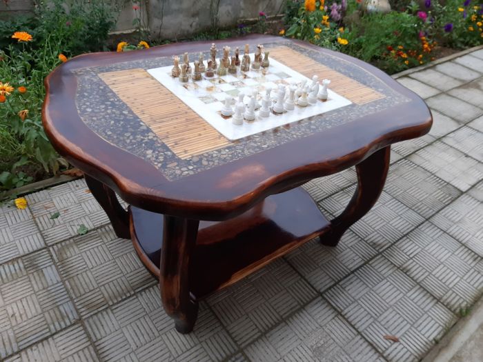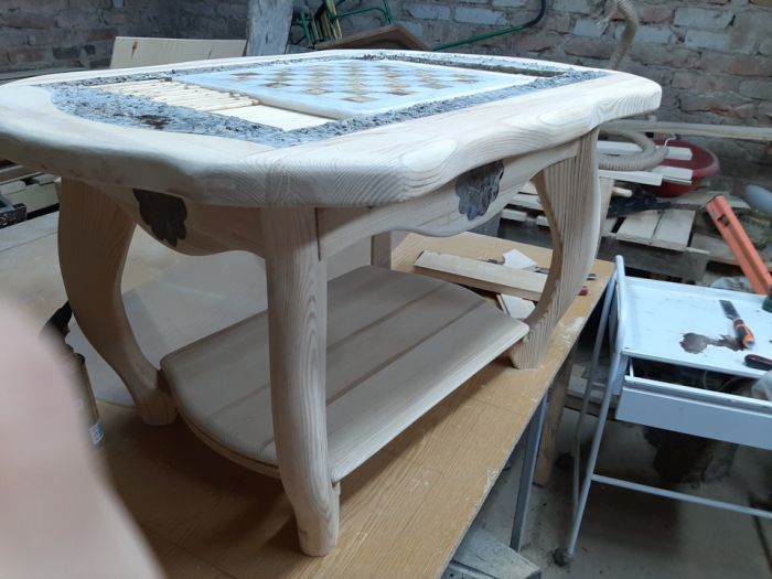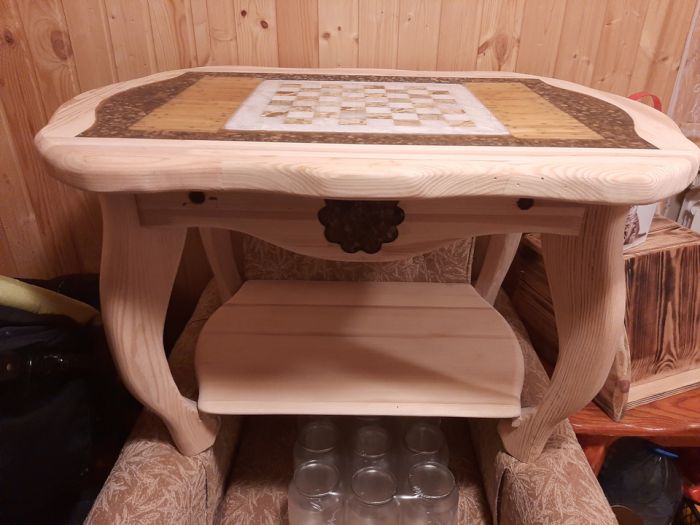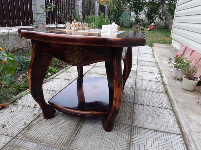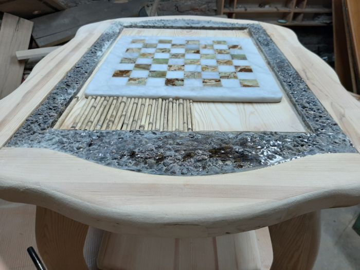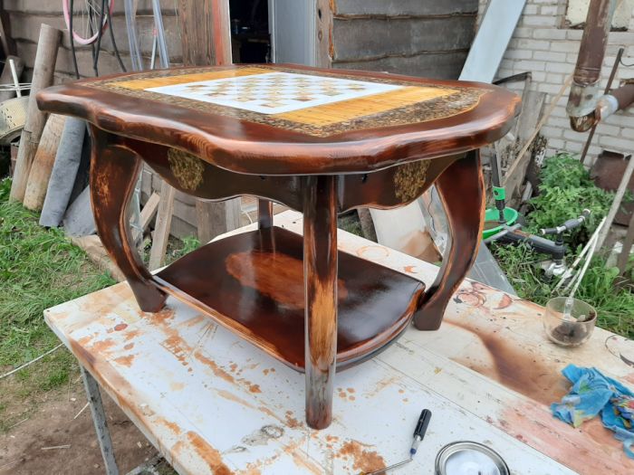 Сделал этот столик из старых филенчатых дверей (массив сосны) в столешницу была залита шахматная площадка из мрамора, а также сушеный тростник и камушки! заливал столешницу эпоксидной смолой в четыре этапа!