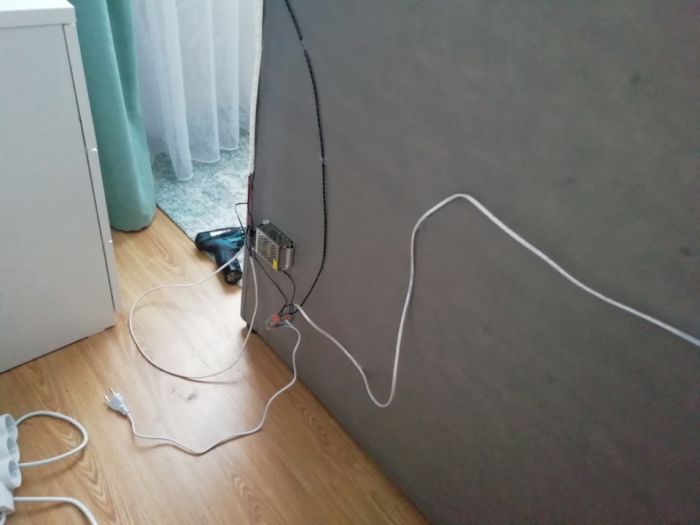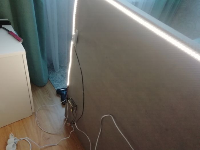 Сделано вот так. Сначала степлером к спинке прибита полоска от декоративного строительного уголка. И на него скотчем приклеена светодиодная лента.