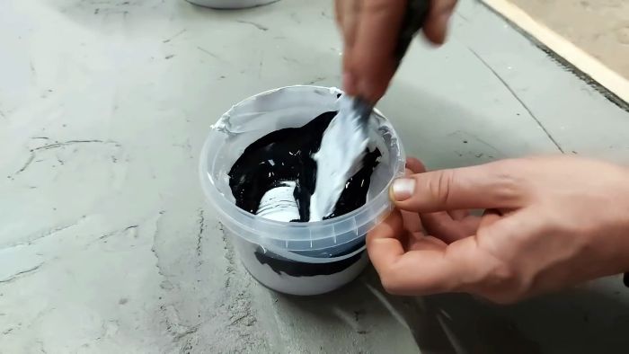 В акриловую латексную краску белого цвета добавляем черный пигмент для получения темно-серой краски, которую наносим на декорированное дверное полотно. Остаток краски сохраняем, она нам еще пригодится.