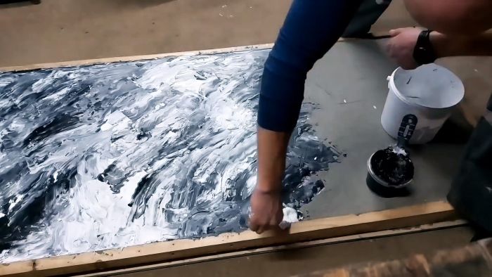 После высыхания грунтовки, приступаем к декорированию дверного полотна. Для этого часть полимерной шпаклевки перемешиваем с черным колером. На шпатель с белой шпаклевкой добавляем немного черной шпаклевки и наносим полученную смесь на дверное полотно по технике «дрожащая рука». В результате поверхность приобретает черно-белую хаотичную окраску.