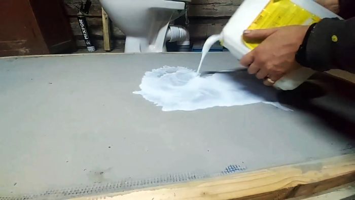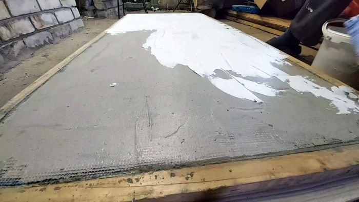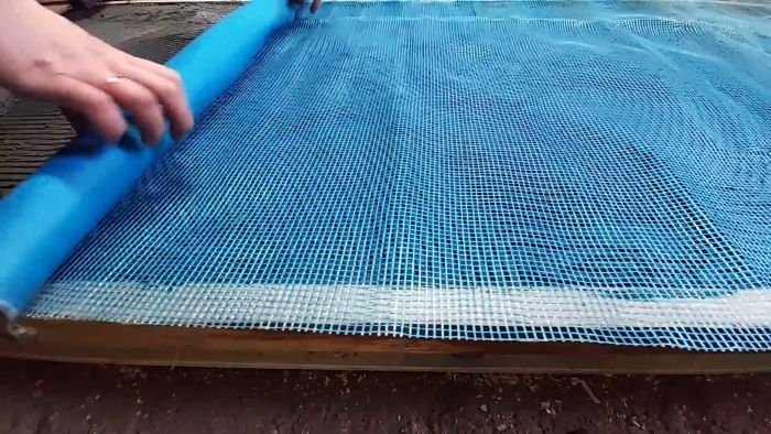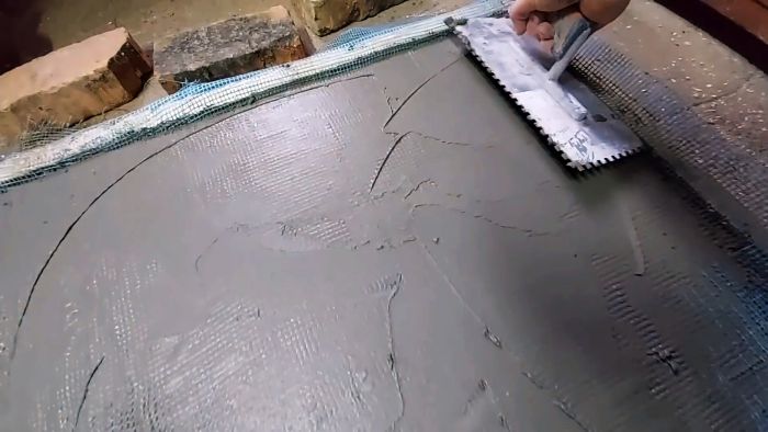 Чтобы конструкция не развалилась и приобрела прочность монолитной плиты, накрываем ее синей штукатурной сеткой и заштукатуриваем тем же плиточным клеем. Для отвердения клея оставляем конструкцию на ряд дней в покое. Остатки сетки отрезаем ножом.