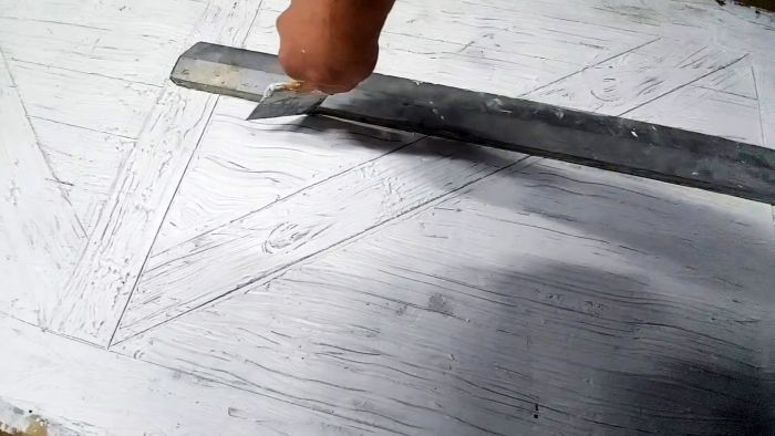 Далее врезаем замок над закладной. Для этого выбираем материал под замок и в поперечном направлении сверлим отверстия нужной формы и размеров. Приступаем к декорированию второй стороны двери под дерево. Для этого всю поверхность покрываем белой шпаклевкой, а из пластиковых крышек емкостей делаем шпатели с различными зубчиками.