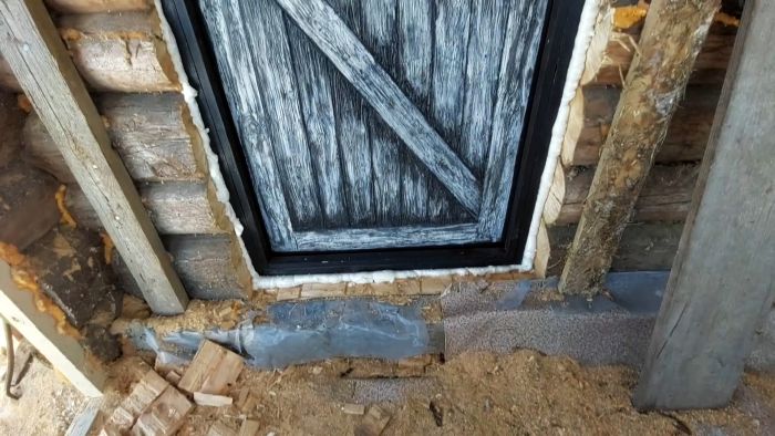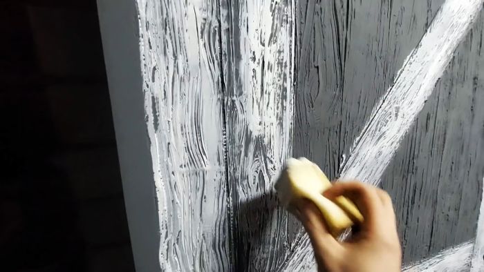 Используя правило, как шаблон наносим края досок обвязки двери. Затем создаем текстуру продольными движениями самодельных шпателей. Далее продолжаем наносить контуры досок уже проверенным способом. Удаляем образовавшиеся на поверхности шпаклевки дефекты.