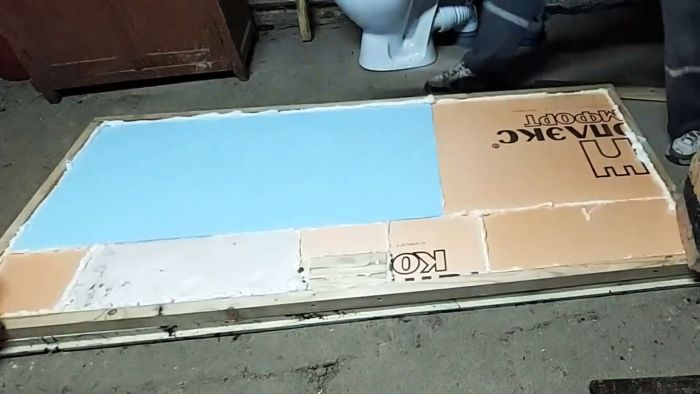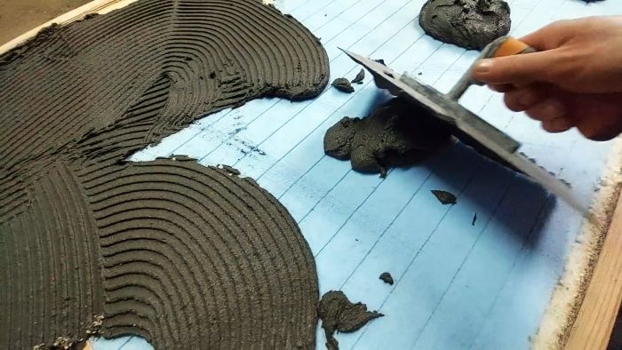 Для затвердевания монтажной пены и превращения в монолит кусков утеплителя прижимаем их через деревянные бруски кирпичами и камнями. Груз также укладываем на 4 угла и оставляем на время. Излишки застывшей монтажной пены удаляем ножом. Наводим на поверхности утеплителя шероховатость металлической щеткой для улучшения сцепления с плиточным клеем, который равномерно наносим на утеплитель.