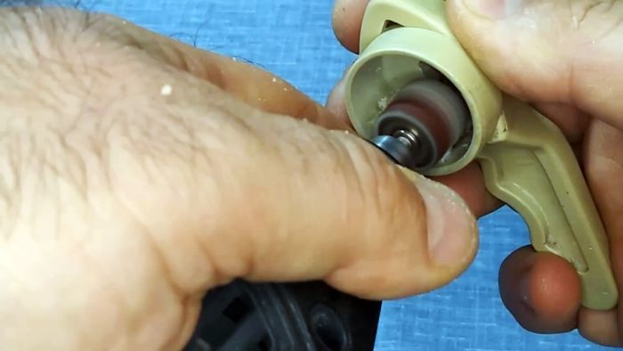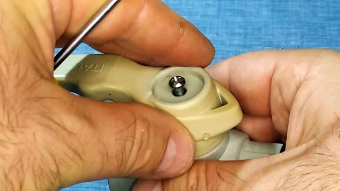 Удаляем на управляющей ручке защитный колпачок, выкручиваем крестообразной отверткой винт, которым ручка крепится к штоку, и с помощью электродрели удаляем ограничительный наплыв на боковой стороне посадочного гнезда ручки. В результате управляющая ручка после установки на старое место будет иметь возможность совершать полный оборот в обе стороны без заедания и упора в ограничитель.