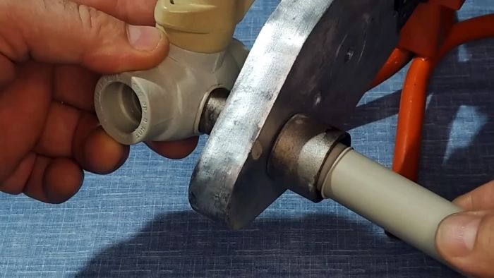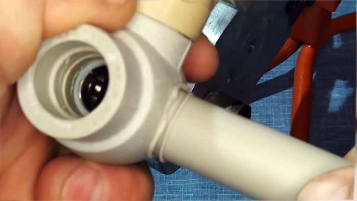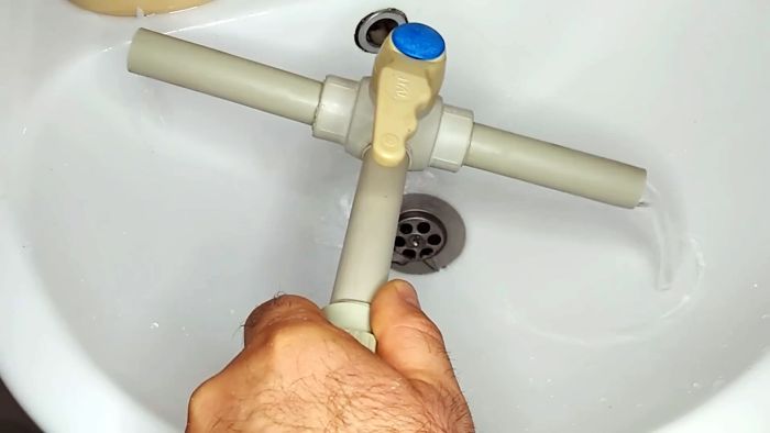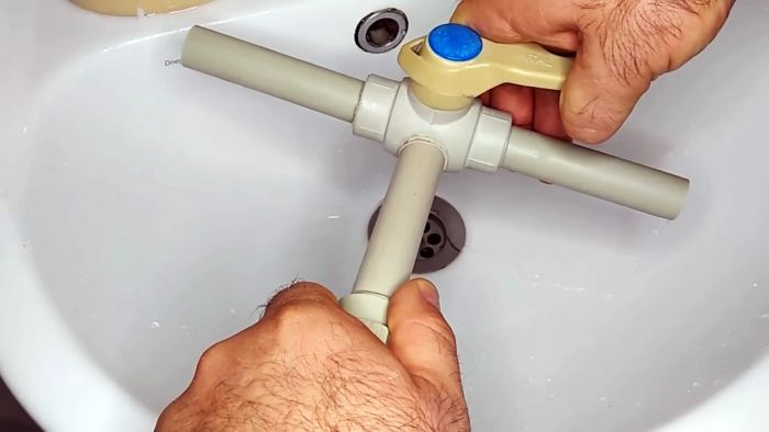 Устанавливаем доработанную ручку на полипропиленовый кран, затягиваем винт и ставим на место защитный колпачок. С помощью аппарата для сварки пластиковых труб припаиваем трубу к отверстию, выполненному в корпусе крана. К свободному концу трубы подсоединяем гибкий шланг и подаем воду.