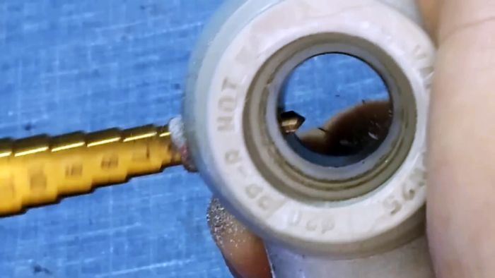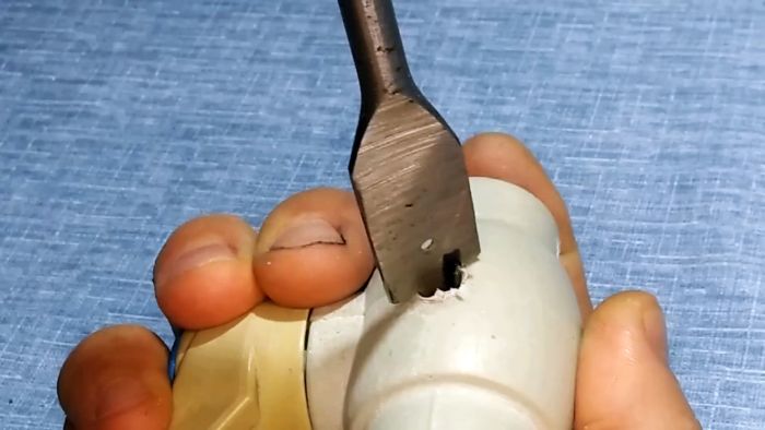 Далее рассверливаем полученное отверстие в стенке полипропиленового корпуса крана перьевым сверлом диаметром 18 мм. Затем увеличиваем в диаметре тем же ступенчатым сверлом ранее просверленное в металлической части запорного устройства небольшое отверстие.