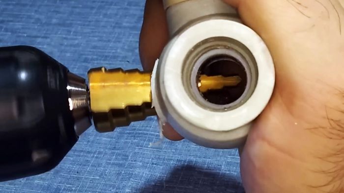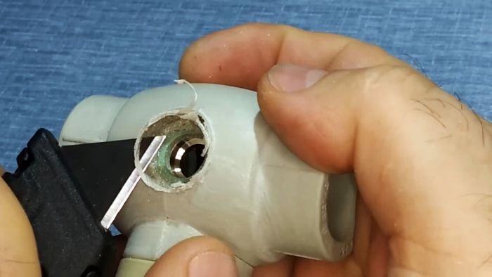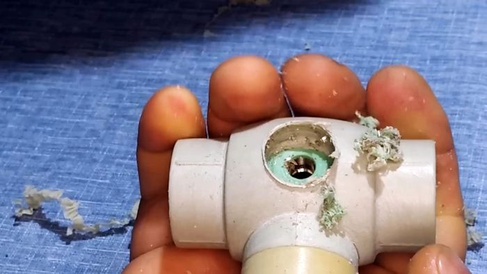 С помощью специального ножа удаляем с кромки отверстия в полипропиленовом корпусе, оставшиеся после сверления заусенцы, и формируем круговую фаску. Удаляем из просверленного отверстия и внутренней части крана с помощью старой зубной щетки частицы и пыль, образовавшиеся во время процесса сверления.