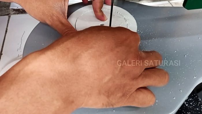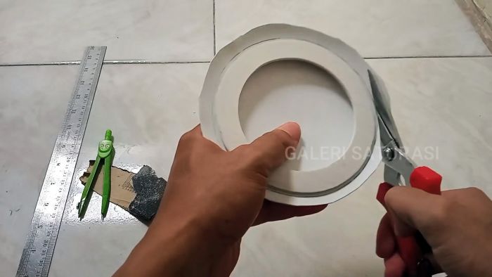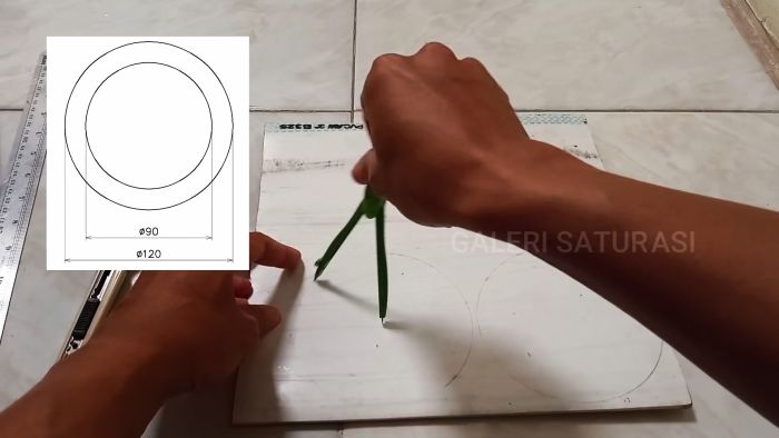 Из листа ПВХ 28×28 см вырезаем 4 круга диаметром 12 см. Внутри кругов проводим циркулем окружности диаметром 9 см и вырезаем лобзиковой пилой кольца с наружным диаметром 12 см и внутренним 9 см.