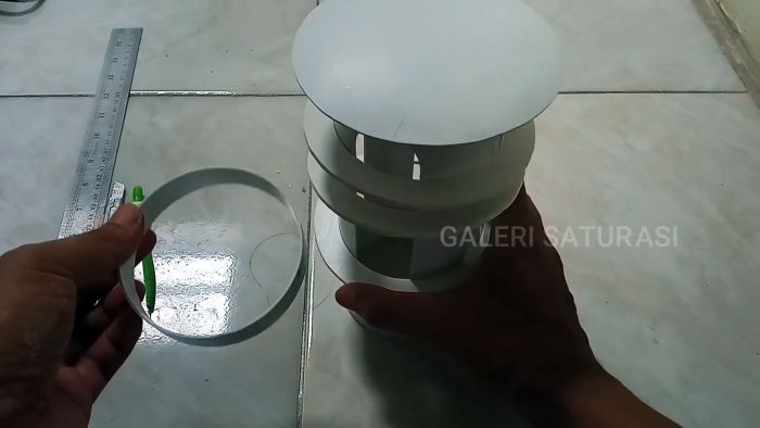 Из листа ПВХ 15×15 см, периодически нагревая его над пламенем горелки газовой плиты, формируем, пользуясь казаном с круглым дном, сферическую поверхность. Пользуясь кольцом в качестве шаблона, вырезаем ножницами из листа с выпуклой поверхностью куполообразный круг диаметром 12 см.