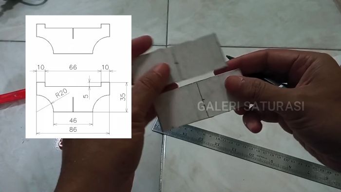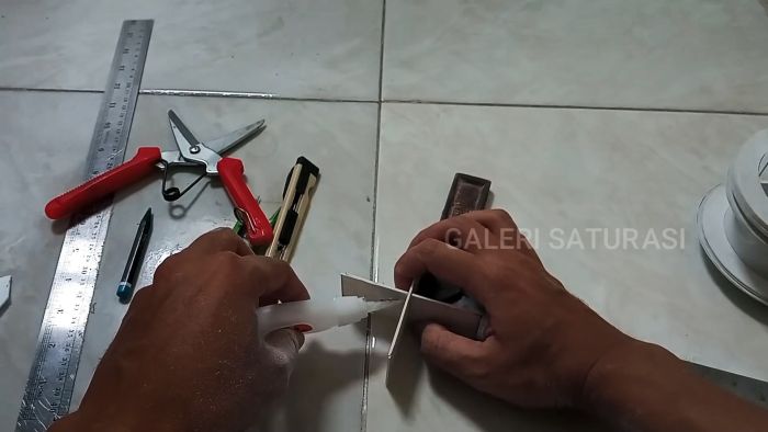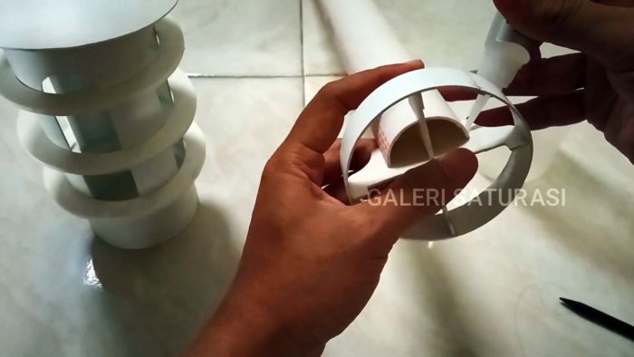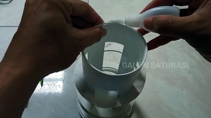 В основание трубы с прорезями вставляем разрезное кольцо и место стыка скрепляем накладкой с помощью суперклея. Из двух пластин ПВХ 9×3,5 см собираем крест по чертежу, который вставляем в кольцо и закрепляем клеем.