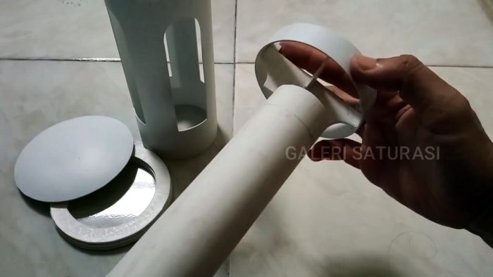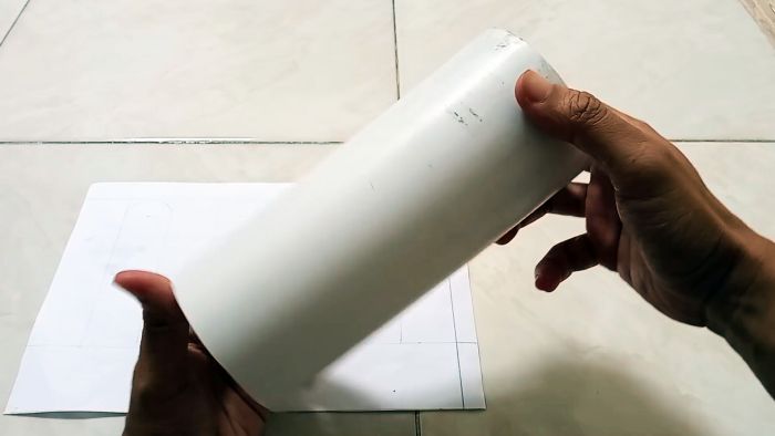 С трубы ПВХ диаметром 7,6 см и длиной 20 см снимаем глянец наждачкой. Охватываем трубу шаблоном – листом бумаги нужных размеров с контурами прорезей в трубе и закрепляем скотчем.