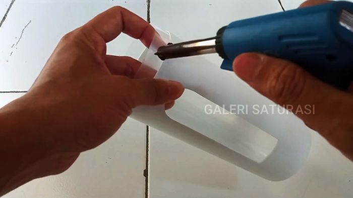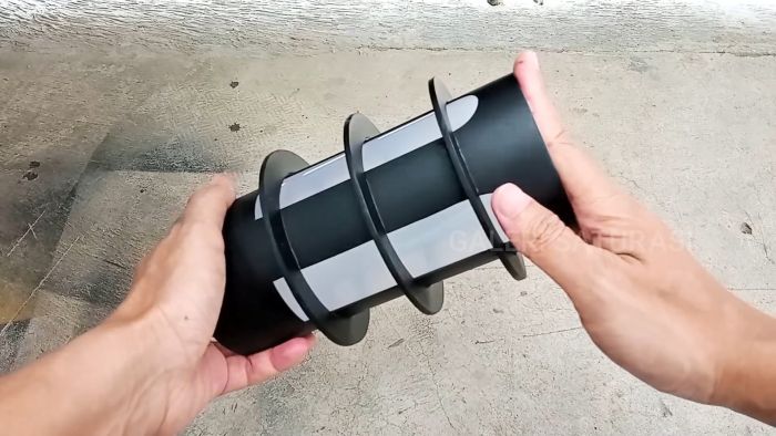 Далее сгибаем прозрачную пластиковую пленку 30×18 см в цилиндр и помещаем в пластиковую трубу с прорезями, выполнив в ней несколько отверстий термопистолетом.