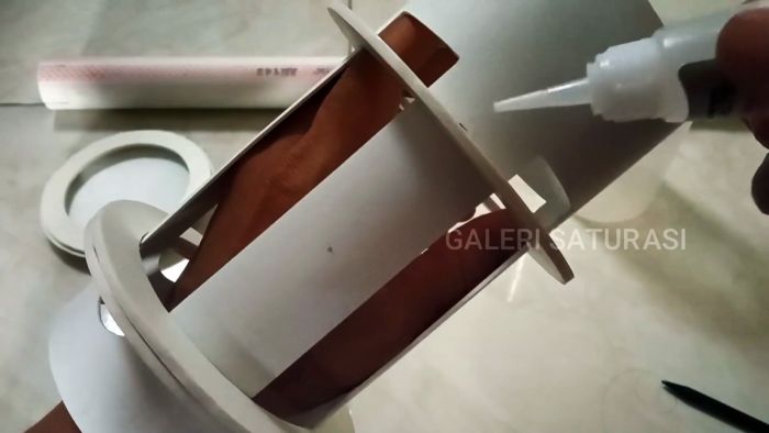 Собираем полученные детали согласно задуманной конструкции посредством суперклея. Трубу и кольцо с крестообразной вставкой выкрашиваем в золотистый цвет, а остальные составляющие светильника – в черный цвет.