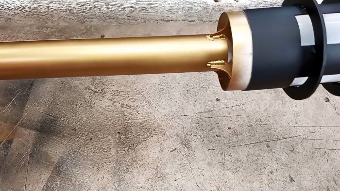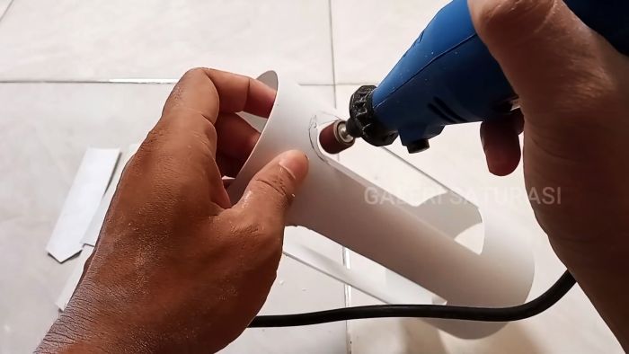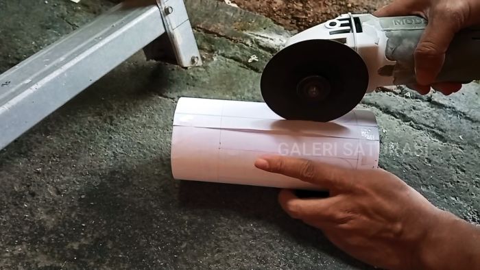 Для дальнейшей работы приготовим трубу ПВХ диаметром 3,2 см и длиной 60 см, выполнив на ее торце взаимно перпендикулярные прорези.