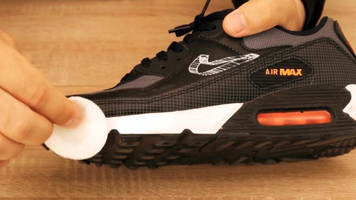 Что же делать? Мыть, скрести щеткой, стирать в стиральной машине? Нет! Есть способ лучше. Обычная жидкость для снятия лака. Трудно поверить с какой лёгкостью она удаляет загрязнения со светлых кроссовок. Достаточно взять ватный диск и нанести на него это чудо-средство. Лёгкими движениями, осторожно втирать его в загрязнения и вся грязь исчезнет. Кроссовки снова белые, как будто они новые.
