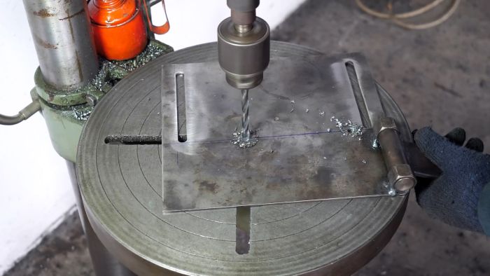 Сверлим намеченные отверстия. Линиями, поперечными длине приставки, соединяем оба отверстия так, чтобы получилась разметка прорезей с закругленными краями. По проведенным линиям прорезаем металл «болгаркой». Зажав плиту в тиски, полученные прорези дорабатываем плоским напильником.