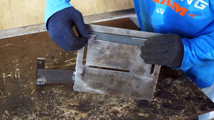 Отрезаем от узкого листа стали, еще один отрезок, длина которого должна позволить изготовить боковую консоль для крепления УШМ к противоположному отверстию на её корпусе. Для этого, полученный отрезок делим на две части. Отступив от края одного из них, размечаем и сверлим отверстие, аналогичное тому, которое было сделано на рабочей плите. Отрезок с отверстием, присоединяем к УШМ так, чтобы он был перпендикулярен «болгарке» и выступал за его пределы на 10-11 см, со стороны, противоположной прорезям на несущей плите. Второй отрезок прикладываем одним концом к рабочей плите, а вторым – к выступающему торцу первого отрезка. «Прихватываем» все стыки несколькими точками сварки и убираем УШМ. После чего хорошо провариваем все соединения.