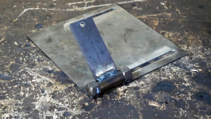 Установив вал с гайками на край оставшейся 1\3 плиты, привариваем гайки к плите, так, чтобы вал шарнира был перпендикулярен её длинной стороне.