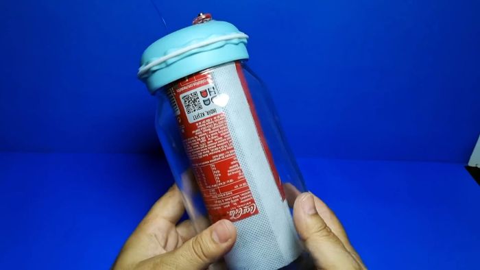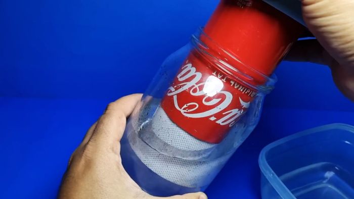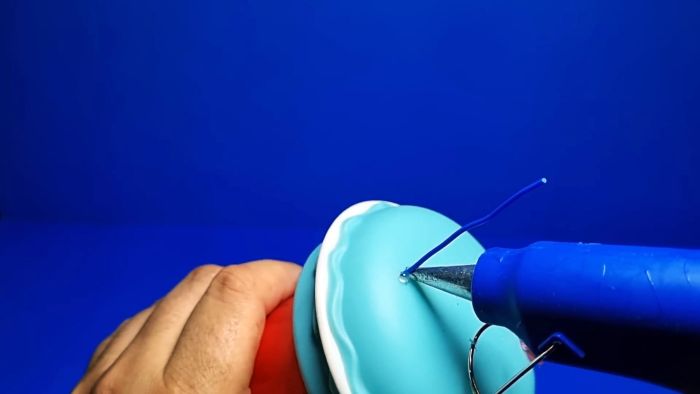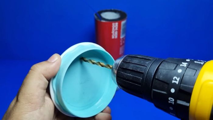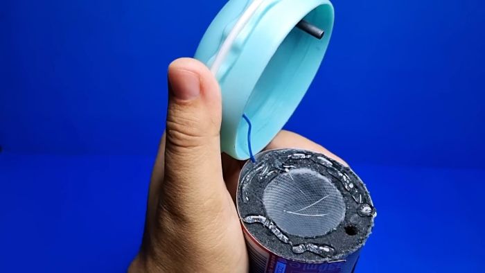 Также сверлим к крышке отверстие под провод от листа. На торец фильтра наносим горячий клей, и приклеиваем его к крышке емкости так, чтобы электрод попал в отверстие в фильтре.