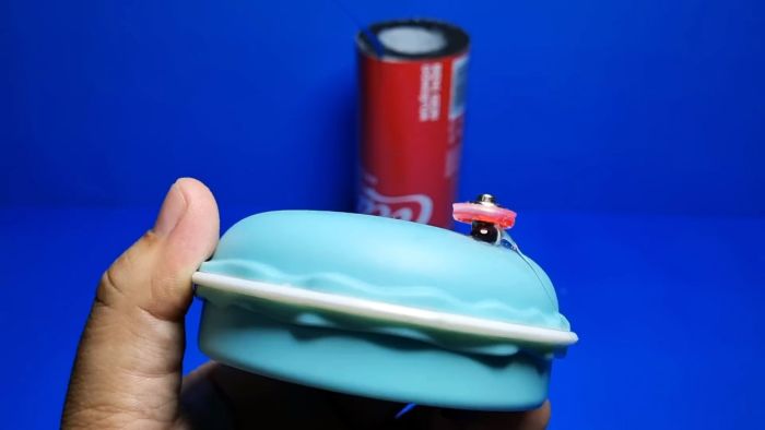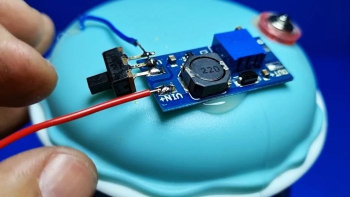 Также при помощи горячего клея приклеиваем преобразователь на верх батареи, припаиваем провода от электродов через переключатель.