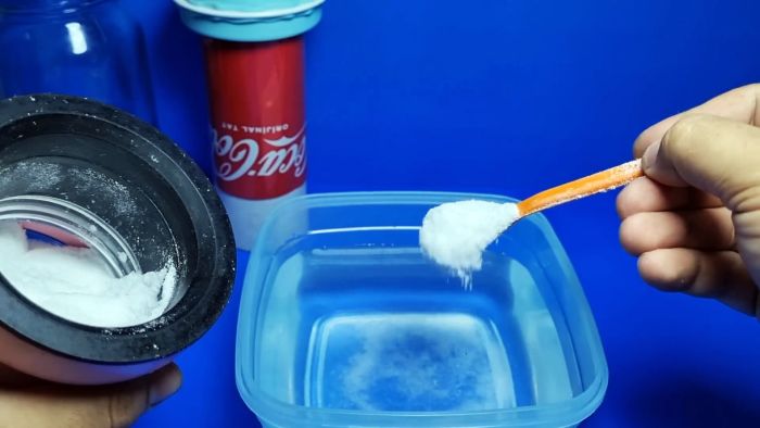 Получилось своеобразная водно-солевая батарея. Для ее заправки возьмем воду и насыпем в нее несколько ложек пищевой, поваренной соли. Помешаем до растворения.