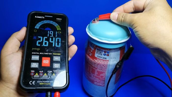Теперь, если подключить мультиметр к электродам, то на дисплее отобразится значение порядка 2,6 В. Конечно, этого для свечения даже светодиода будет недостаточно, но силы тока должно хватить, чтобы запустить преобразователь.