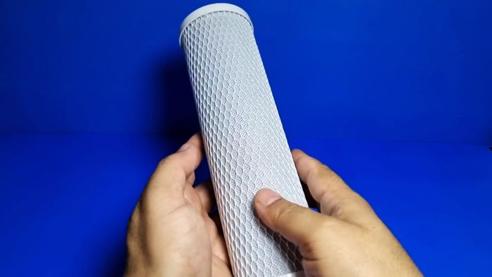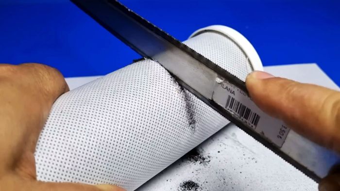 Угольный фильтр необходимо обрезать по длине емкости. Сделать это можно обычной ножовкой. Предварительно ножницами срезается капроновая сетка.