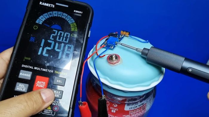 Подключаем мультиметр к выходу преобразователя. Подстроечным резистором настраиваем выходное напряжение на 11-12 В.