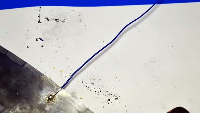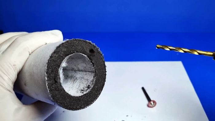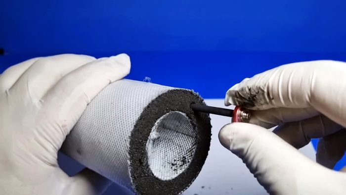 В торце обрезанного фильтра сверлим отверстие под электрод из батарейки.