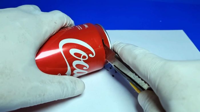 Далее необходимо отрезать вверх и дно алюминиевой банки. Затем получившийся цилиндр разрезать вдоль, чтобы получился лист.