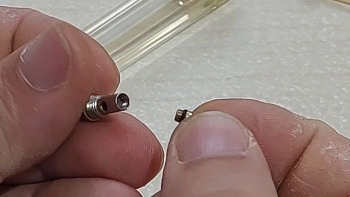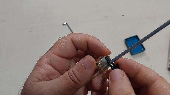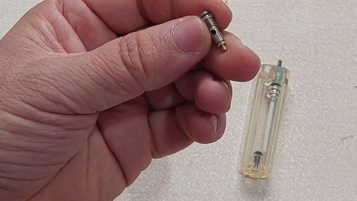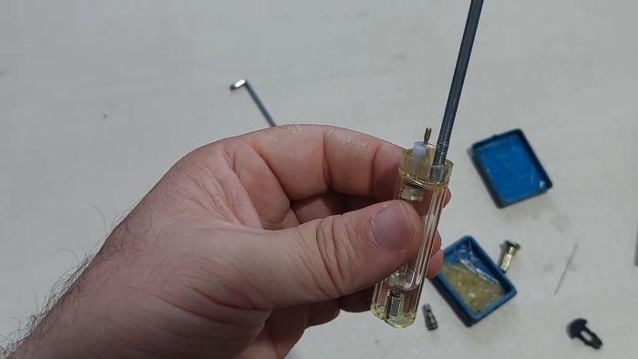 Теперь берем колбу с газом из зажигалки, и вставляем в глухое отверстие ее заглушки отрезок мотоциклетной спицы стороной с резьбой. Вклеиваем его для надежности.