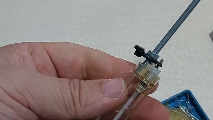 На клапан колбы устанавливается рычаг открытия газа. Затем из бамбуковой шпажки вырезается два коротких отрезка, и приклеиваются на колбу. Они послужат частью опоры для рычага подачи газа.