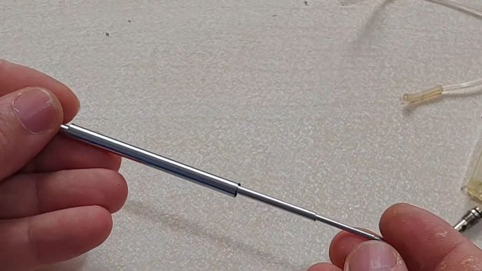 Затем берем телескопическую антенну. От нее потребуется трубка, которая по диаметру подходит для стыковки с форсункой.