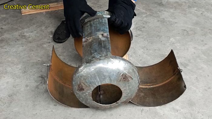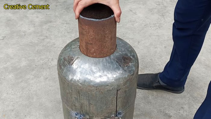 Переворачиваем баллон, и вырезаем в его дне отверстие под размещенную внутри вертикальную трубу.