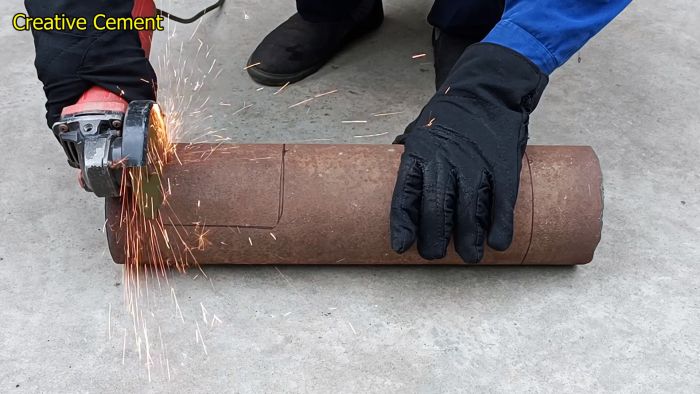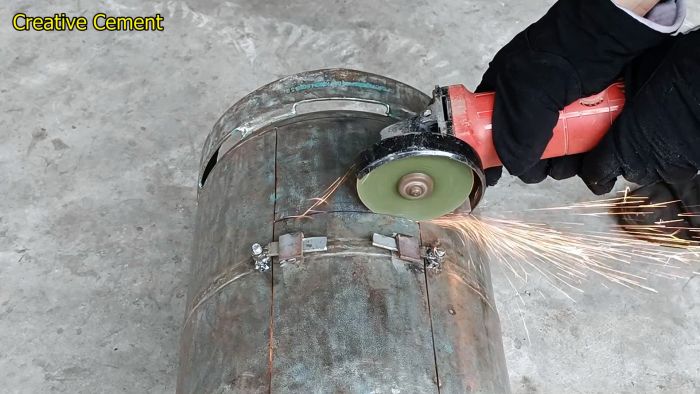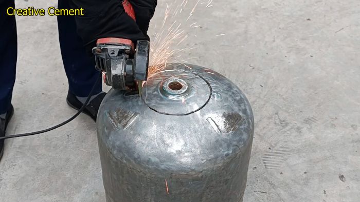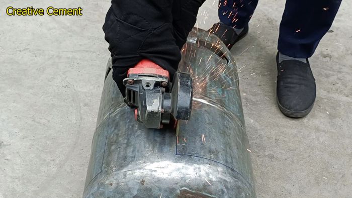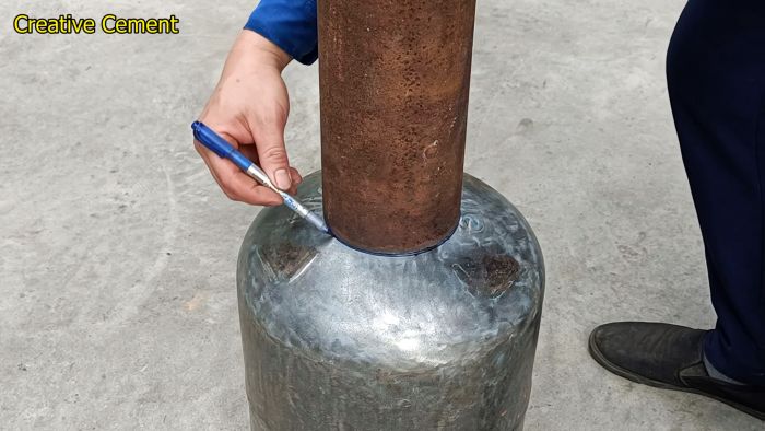 Теперь берем толстостенную стальную трубу 125 мм, и обводим вверху баллона. Затем по этому контуру вырезаем отверстие.
